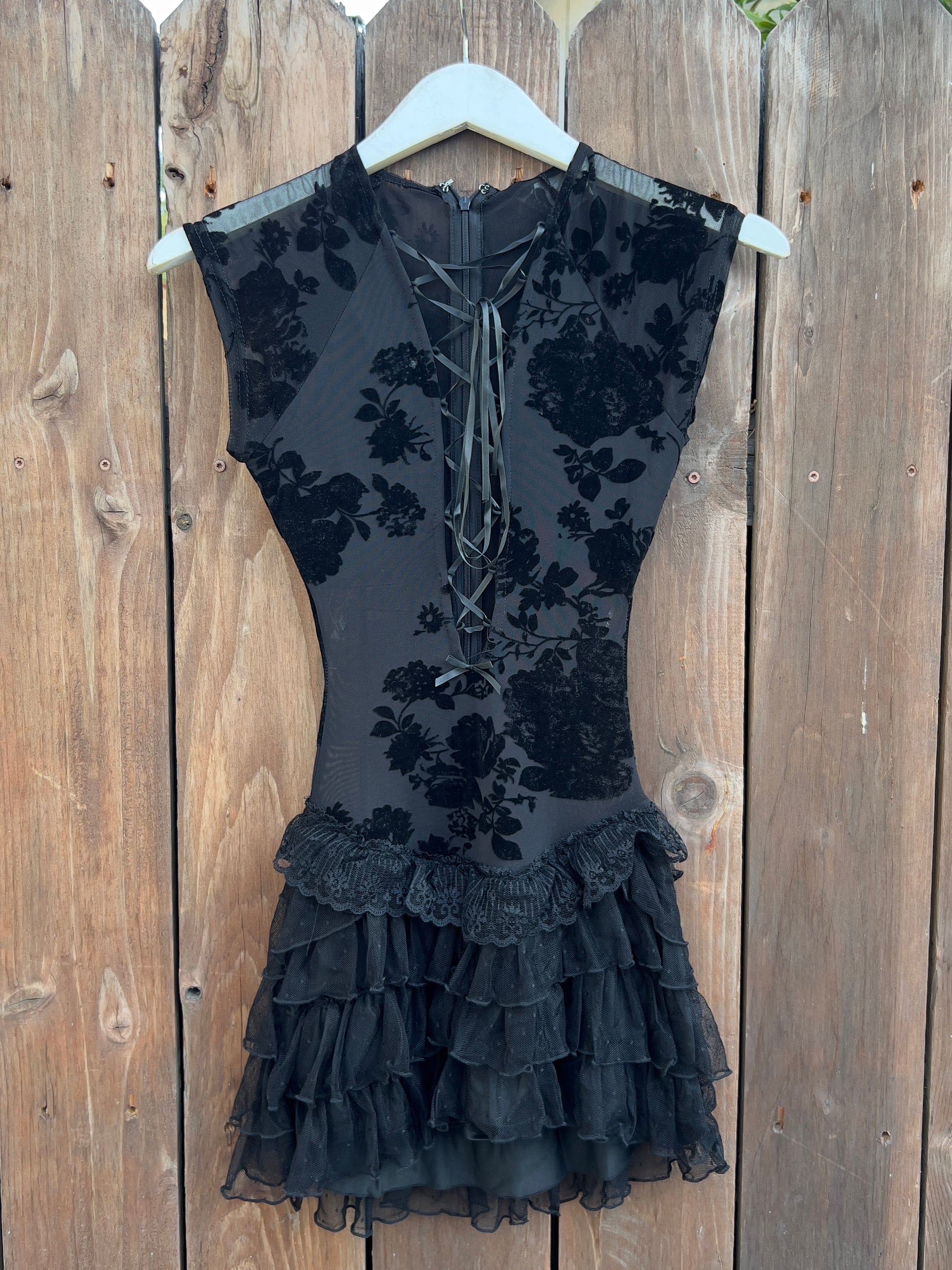 Black Velvet Floral Lace Up Ruffle Mini Dress