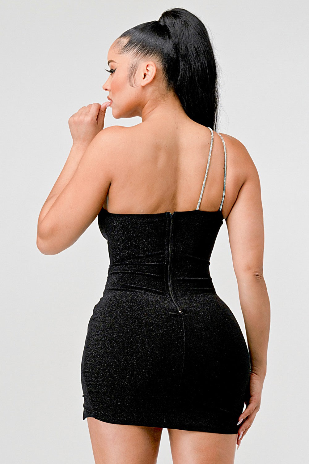 LUREX KNIT GLITTER RHINESTONE STRAPS BODYCON MINI DRESS SELF: 70%NYLON 25%METALLIC THREAD 5%SPANDEX | IMPORTED