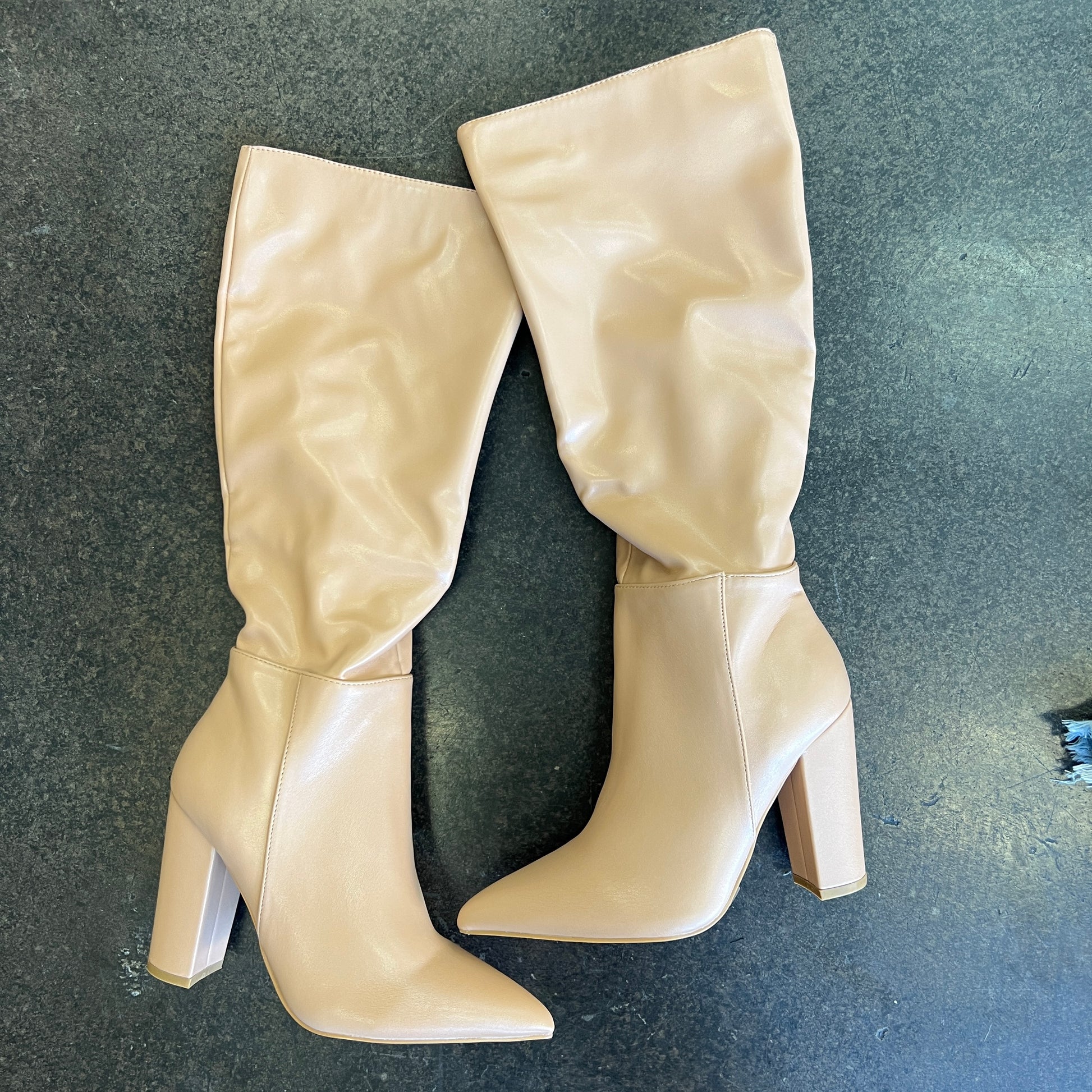 Knee High Pointy Leather Chunk Heel Boots Nude
