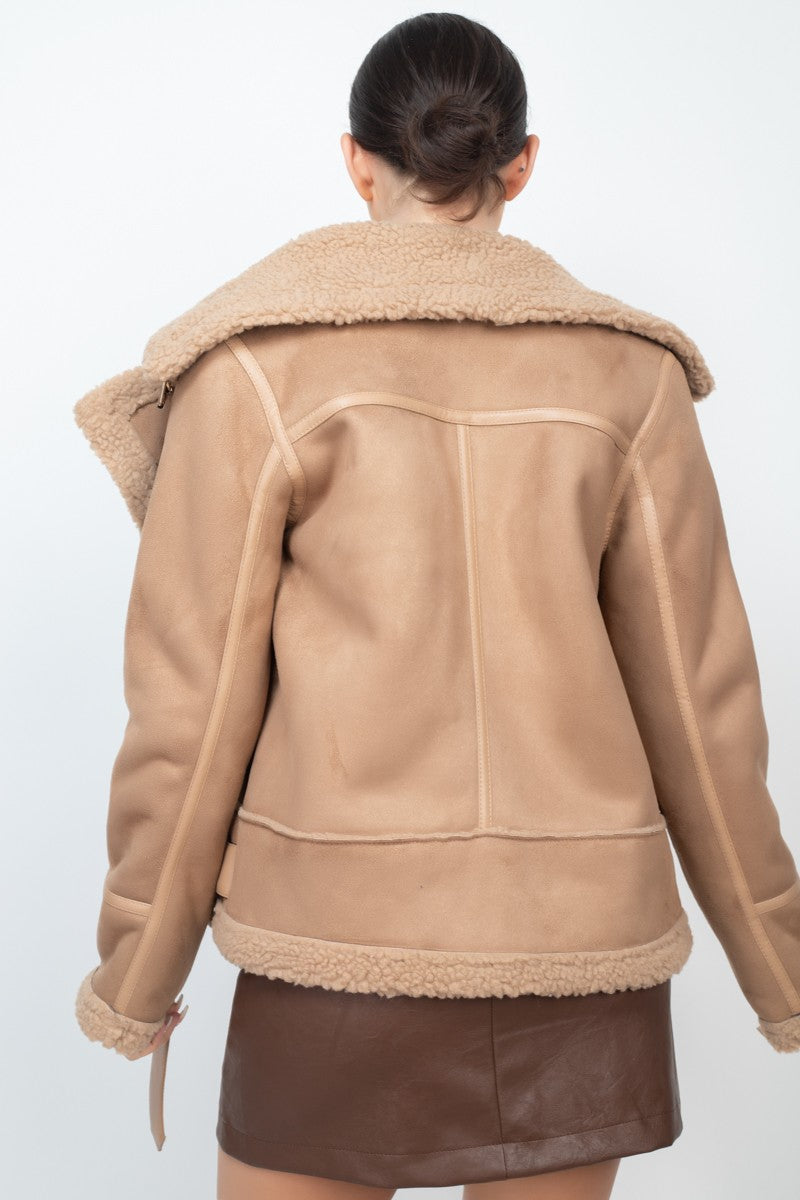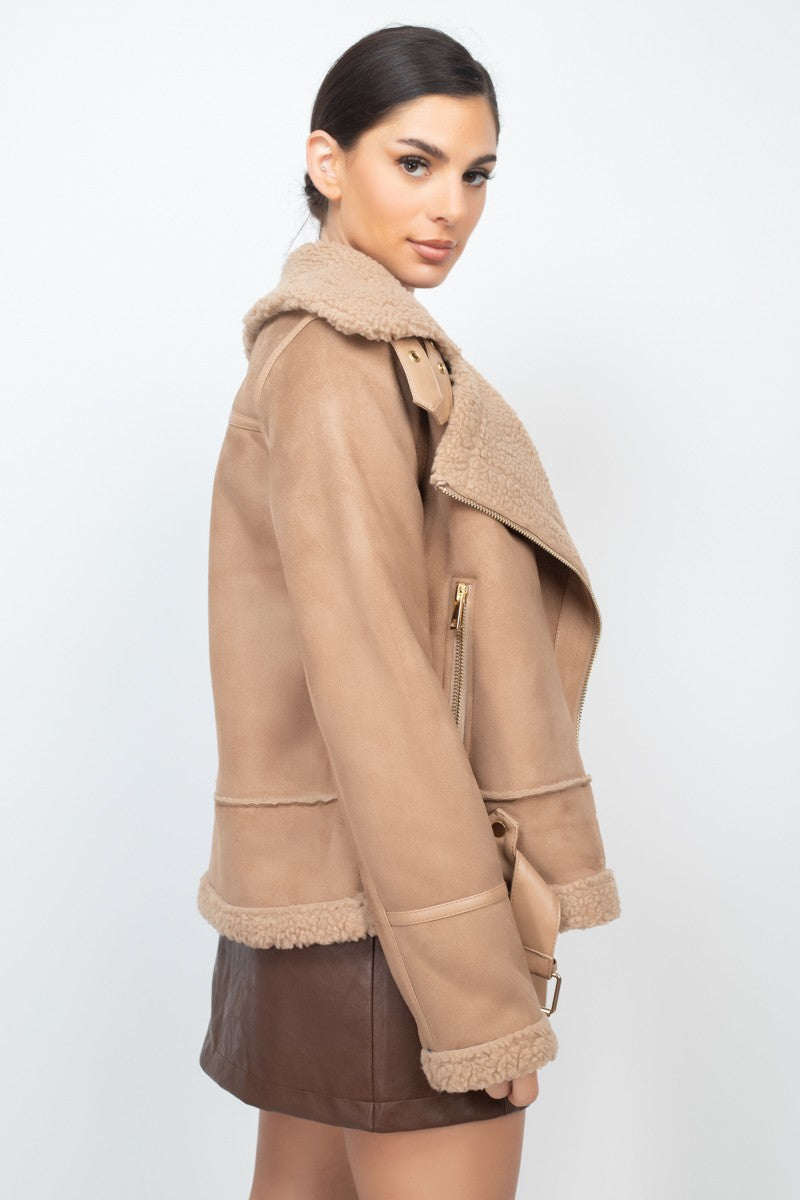 A shearling biker coat featuring faux shearling trim, a front zipper closure, belted waist, buckles at the collar, and side pockets. Made in China