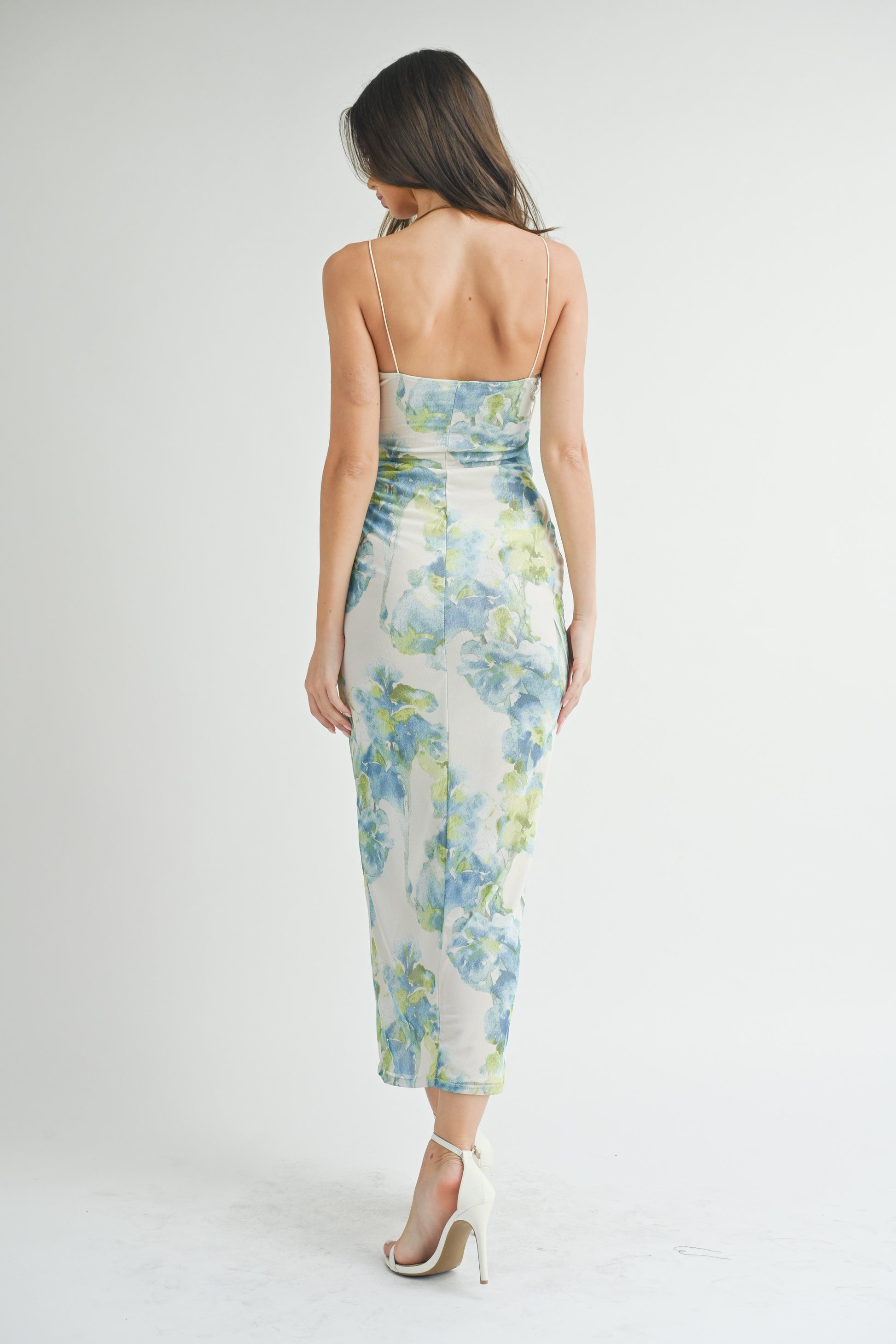 FLORAL PRINTED MESH MAXI WITH FRONT CRISS CROSS LACE UP DETAIL