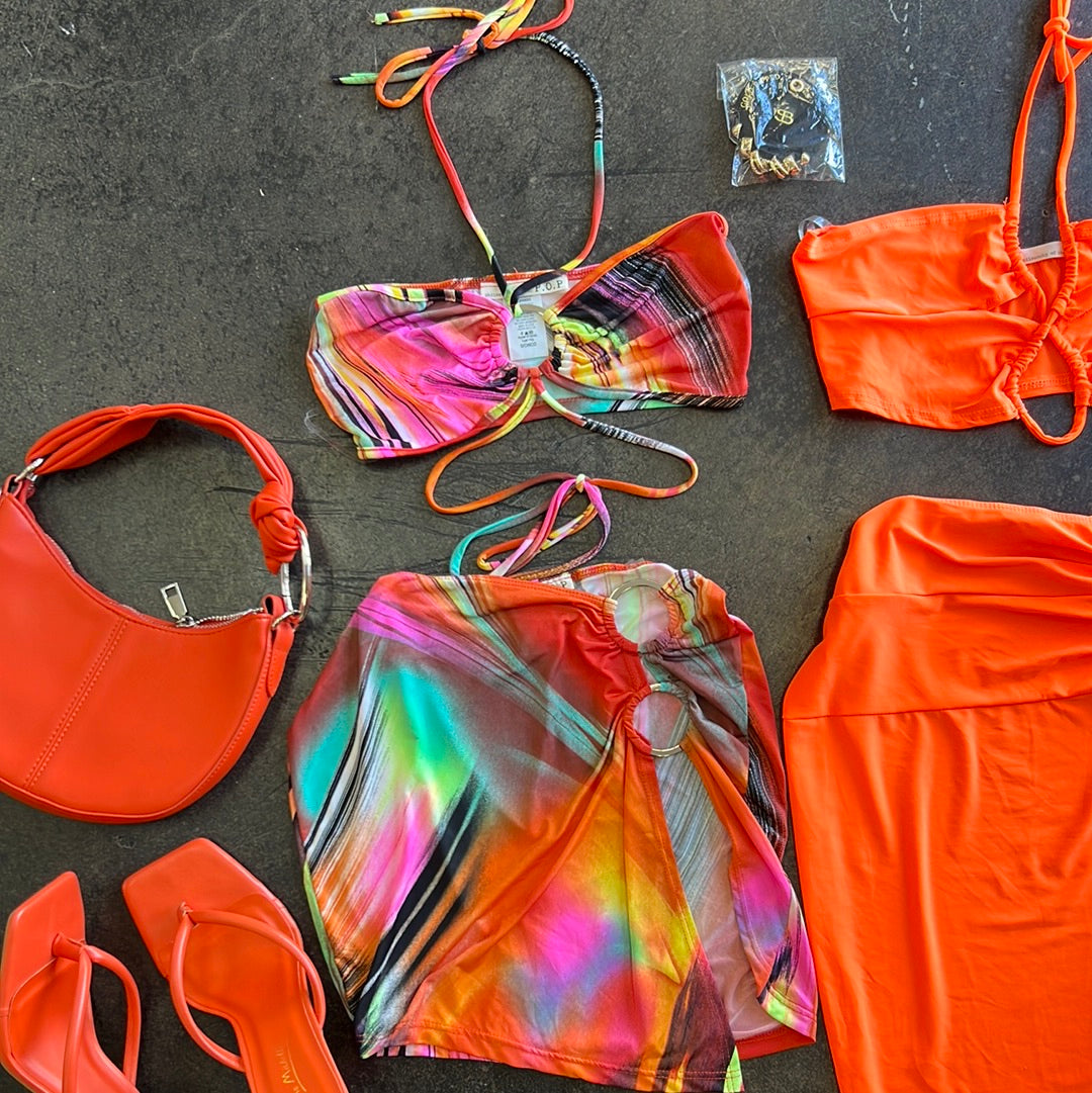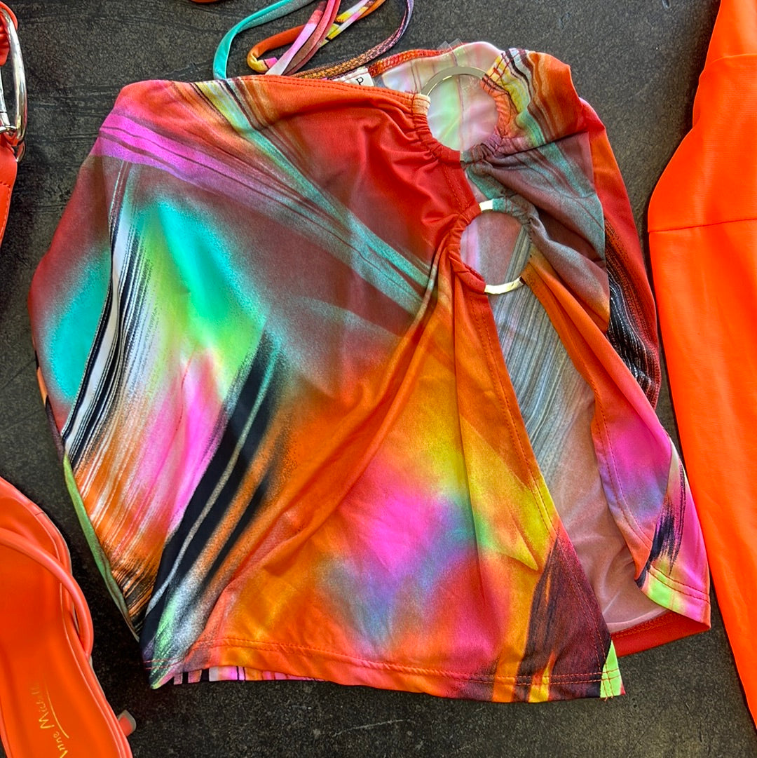 O Ring Mini Skirt Printed Set Pink Yellow Combo
