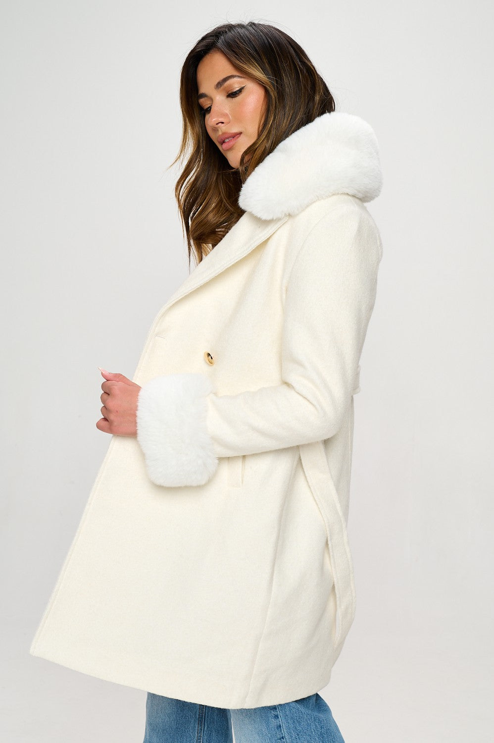 - Vegan Wool - Belted front closure - Removable Faux Rabbit Fur Collar and cuffs - Side entry pocket